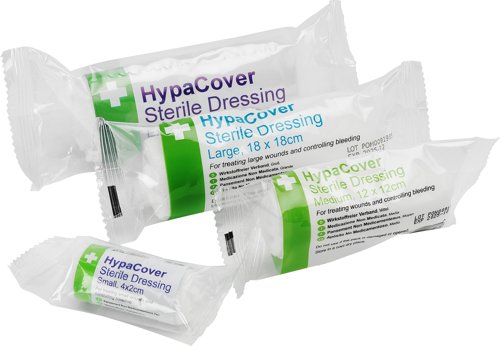 The HypaCover Sterile Dressing is a premium quality wound dressing made to meet HSE first aid recommendations and NHS standards. The individually wrapped dressings are an essential item for any well-stocked first aid kit, and are included in the list of required components for BS 8599-1 and BS 8599-2 compliant kits.